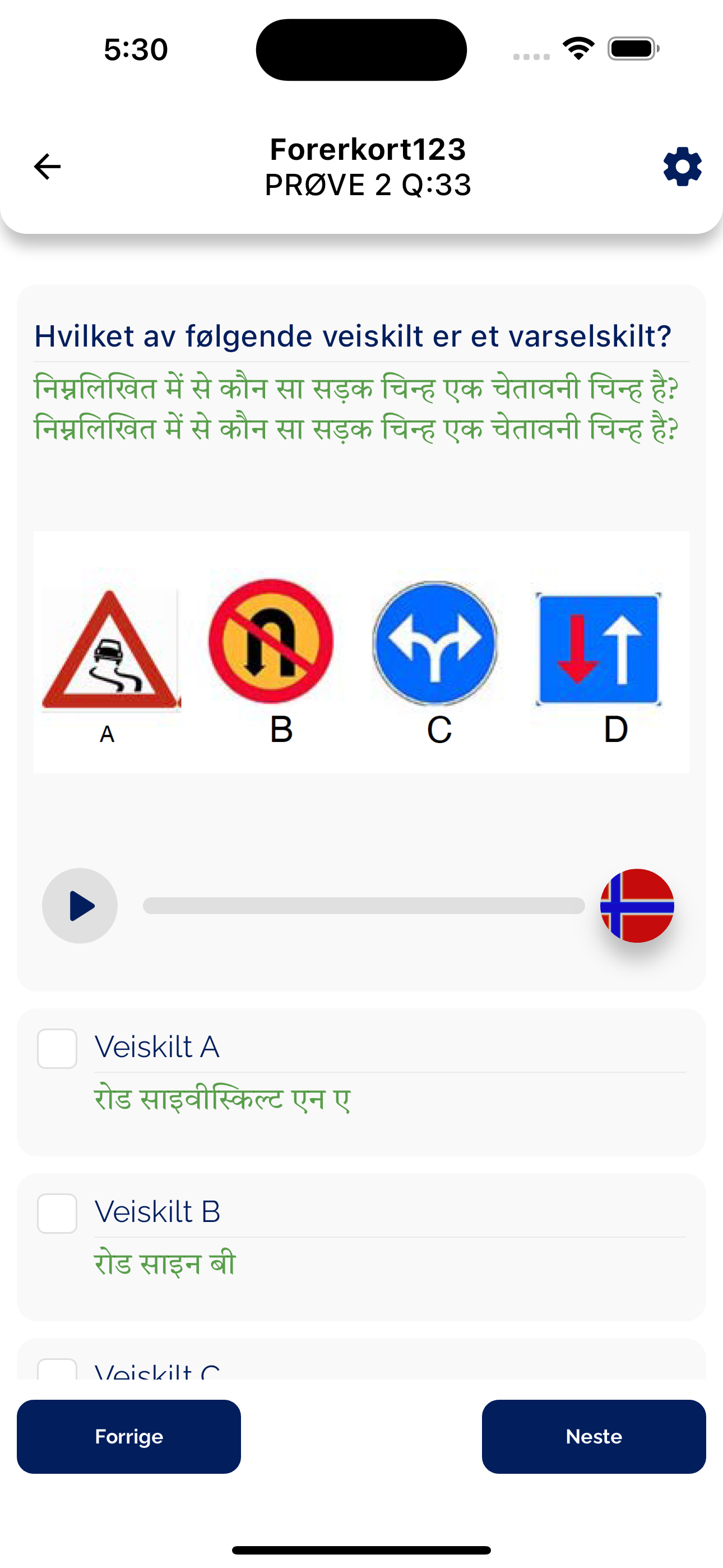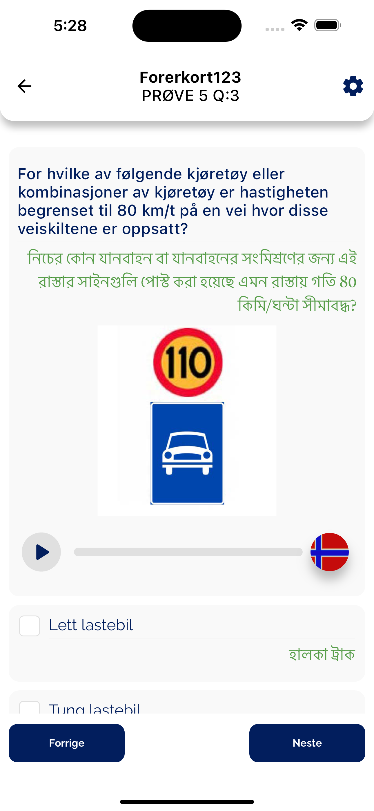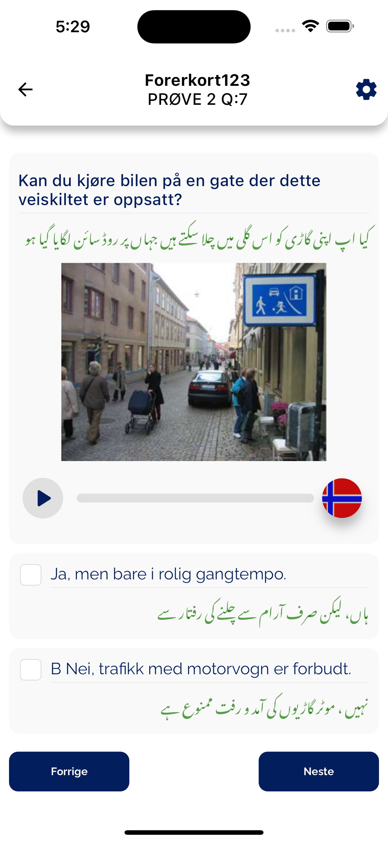 Why should you choose our Forerkort123 App for your driving theory test? You learn the questions in your language. We have translated the questions for your better understanding. -You will be able to hear the test questions in your language to learn quickly -English questions with audio (voice over) are also added so you can practice the questions in your language after learning.