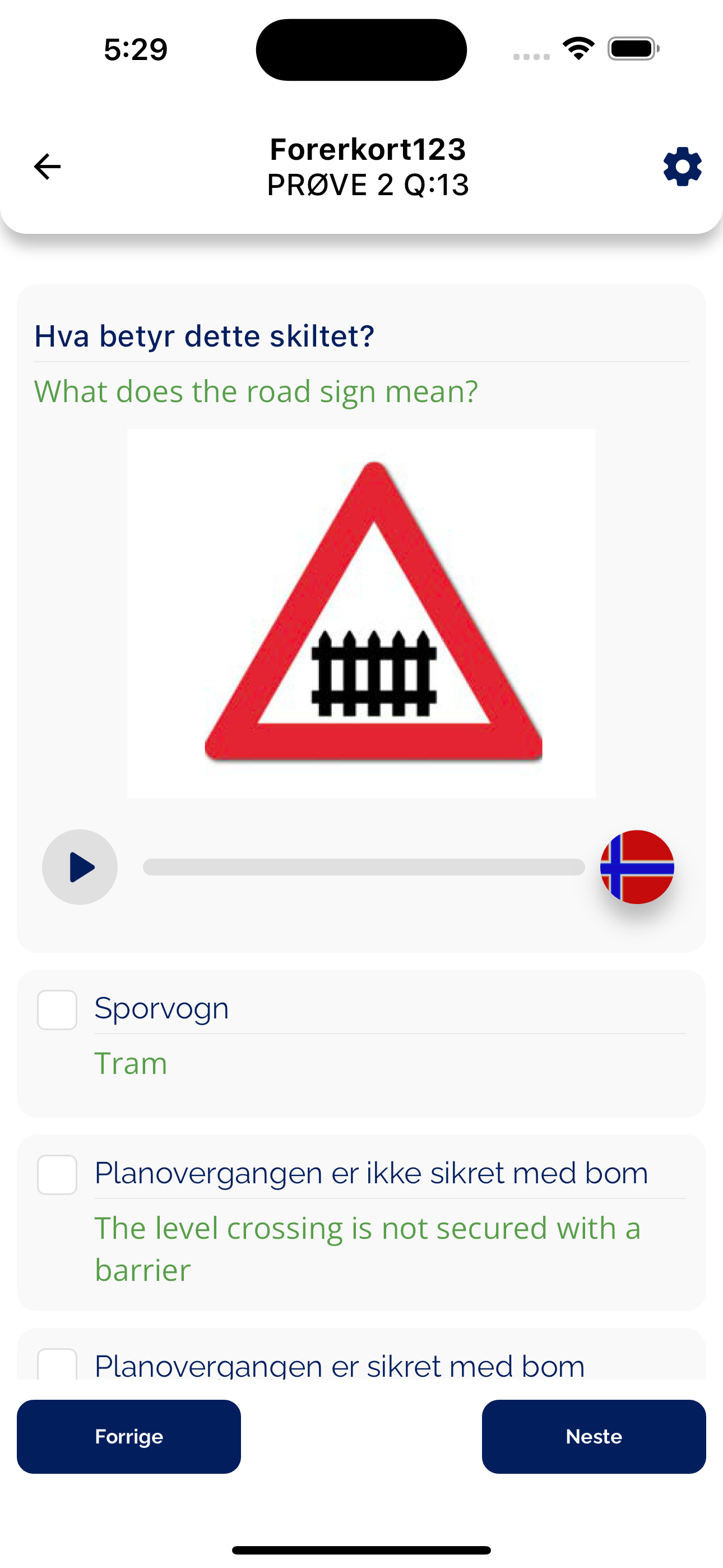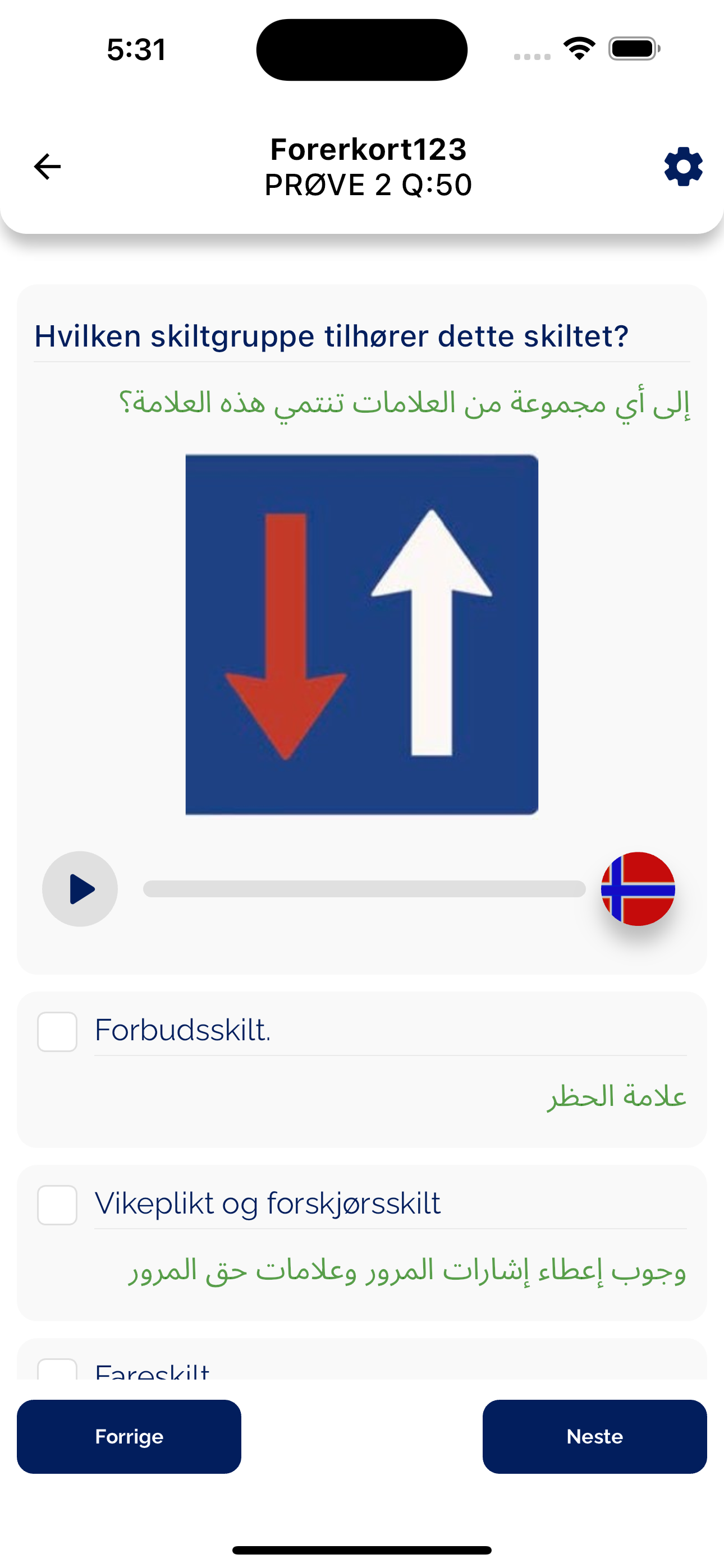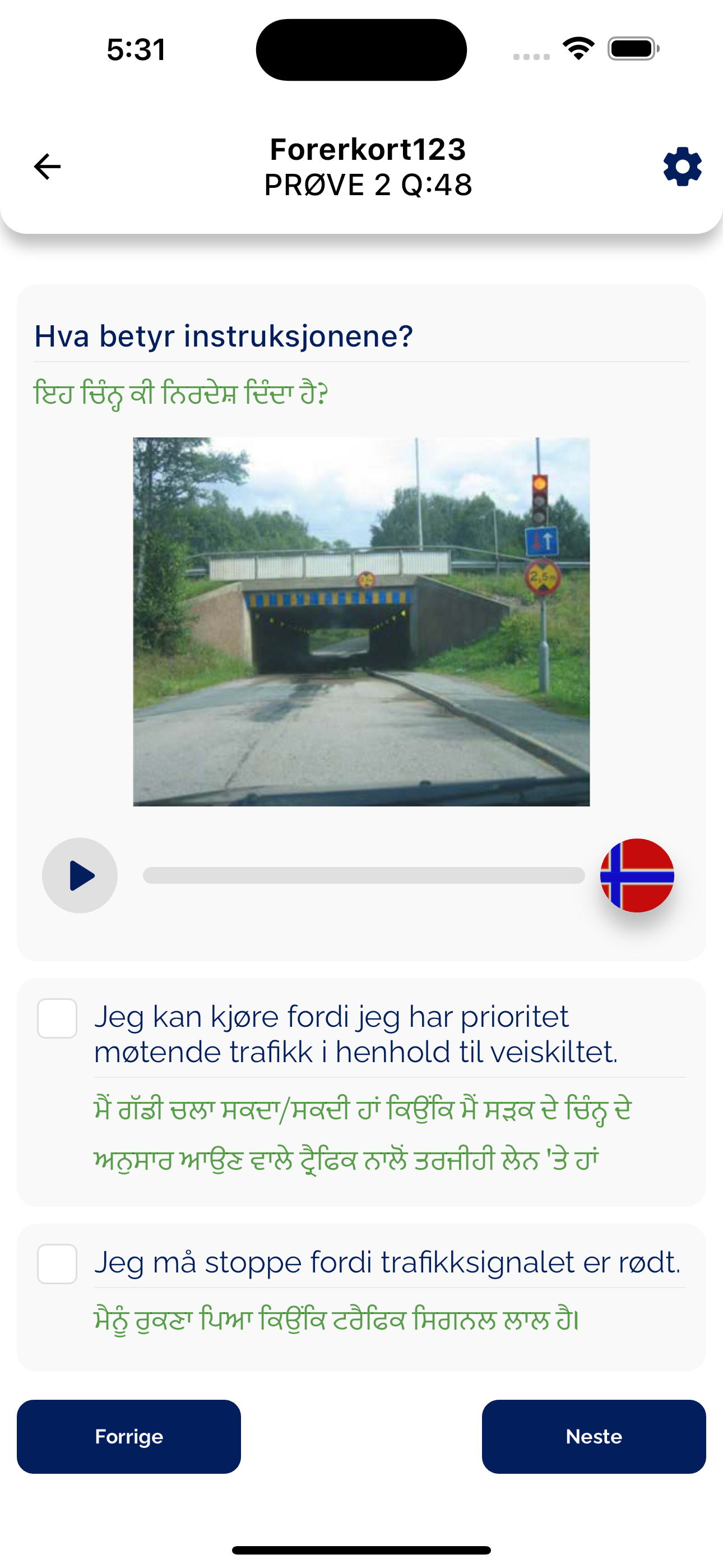 Why should you choose our Forerkort123 App for your driving theory test? You learn the questions in your language. We have translated the questions for your better understanding. -You will be able to hear the test questions in your language to learn quickly -English questions with audio (voice over) are also added so you can practice the questions in your language after learning.